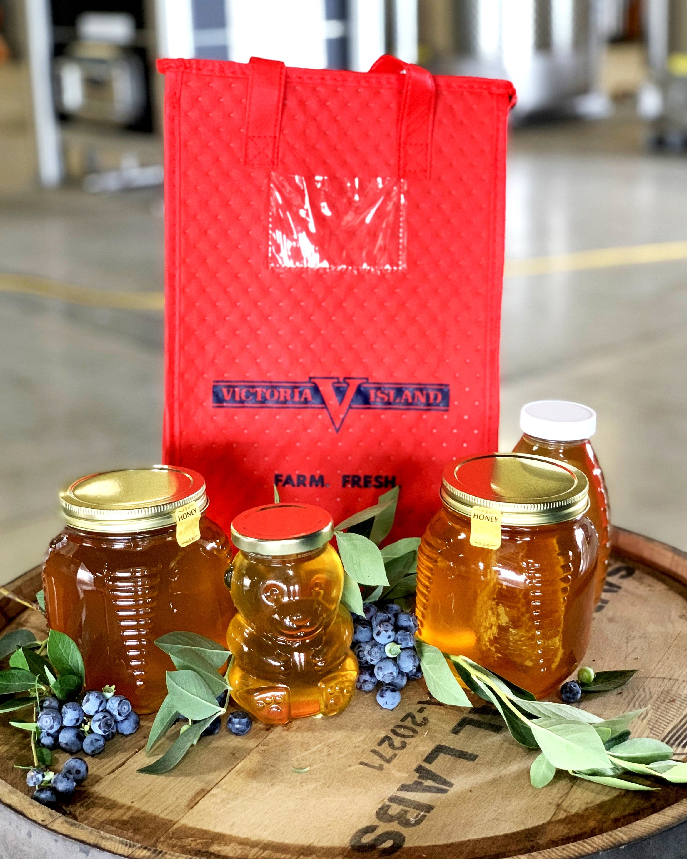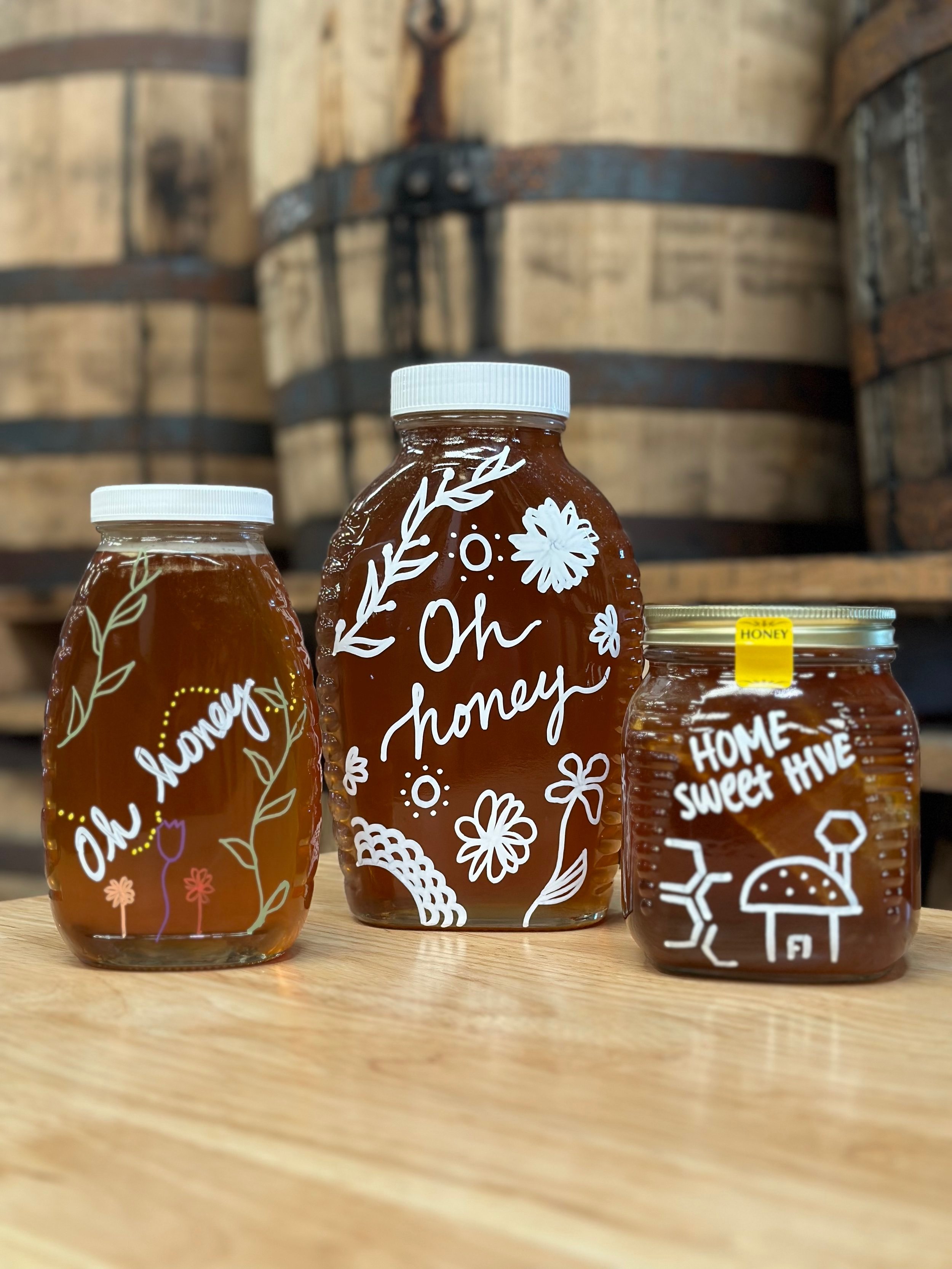Estate honey from our resident blueberry pollinating bees. Multiple varieties including raw honey + blueberry & bourbon barrel infused flavored honey